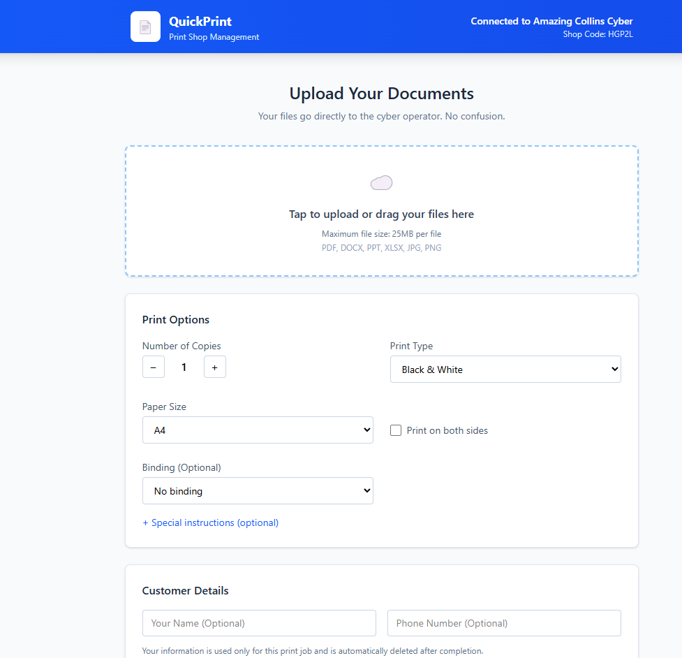 Digital workflow allowing customers to upload documents via QR/link, with operator dashboard and AI tools.